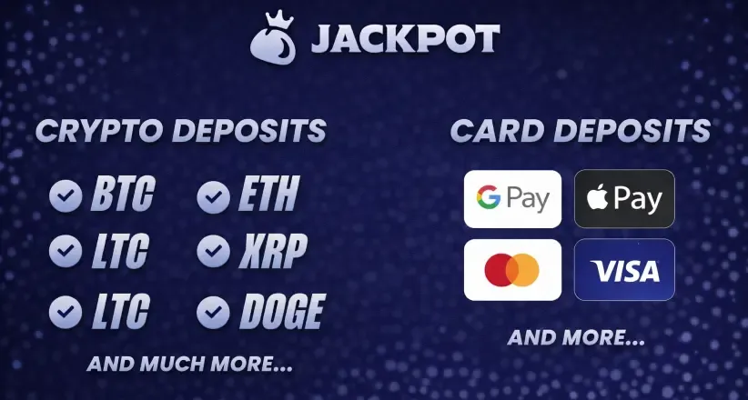 Crypto Payments Jackpot.bet accepts BTC, ETH, USDT, DOGE, SOL, XRP, and more. Copy your wallet address, send funds from your exchange or wallet, and most deposits confirm in under 5 minutes.