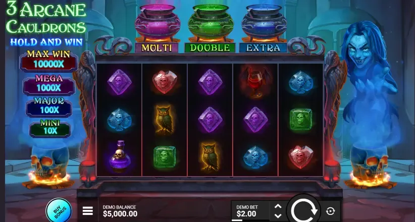 Play 3 Arcane Cauldrons in demo or real money mode on Jackpot.bet, with an e-RTP of 98.17% and a max win of 10,000x your bet.