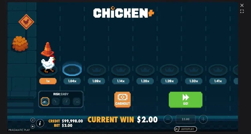 Chicken+ keeps its mechanics tight and focused. There are no bonus rounds or special symbols, the entire feature set is built around risk selection, lane progression, and the decision to cash out or keep going.