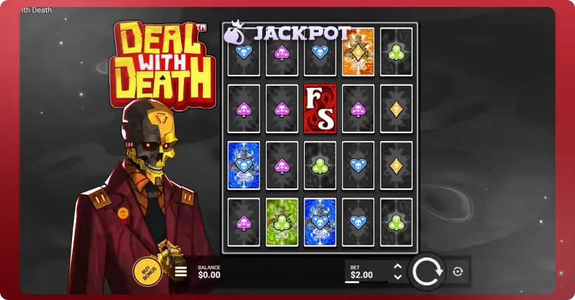 Playing Deal With Death on Jackpot.bet is straightforward, even though the game itself quickly twists expectations. You start by setting your stake and spinning the reels like a classic slot, watching symbols land across the grid as each round unfolds. The base gameplay is designed to feel familiar at first, easing you in before the game begins to reveal its deeper layers.