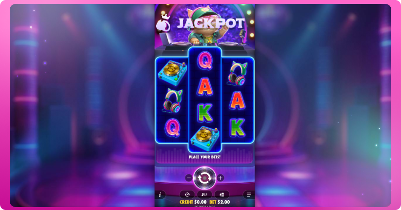 DJ Neko throws you straight into a neon-lit club where every spin hits with rhythm and color. Lights pulse, speakers glow, and the reels move to a steady beat that keeps the action flowing without slowing down.