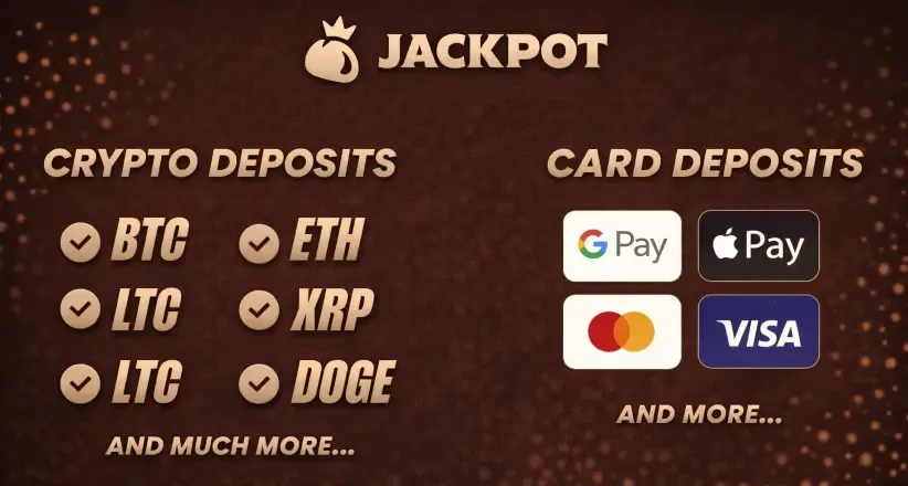 Crypto Payments Jackpot.bet accepts BTC, ETH, USDT, DOGE, SOL, XRP, and more. Copy your wallet address, send funds from your exchange or wallet, and most deposits confirm in under 5 minutes.