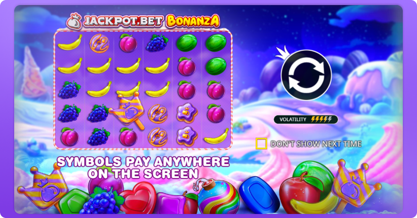 Jackpot.bet Bonanza keeps the instantly recognizable candy-land style players expect, while layering in subtle Jackpot.bet-branded touches that make this game's theme feel distinct.
