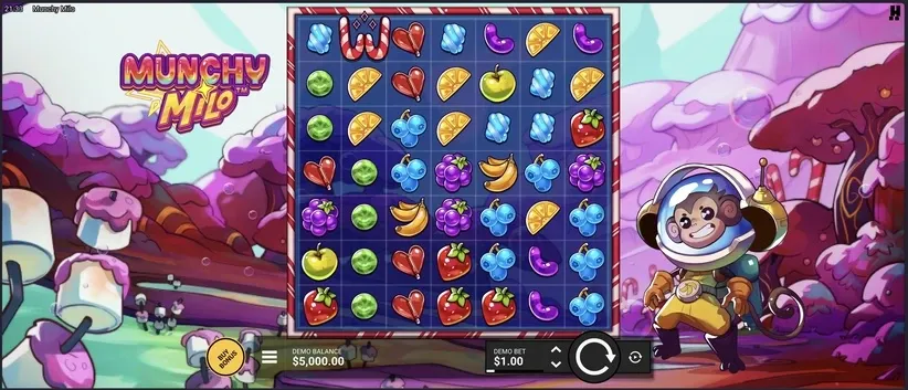 Munchy Milo by Hacksaw Gaming is a 7x7 cluster pays slot built around the Jolt Frame mechanic, a spreading symbol transformer that converts entire rows and columns mid-spin, chains into itself, and stacks multipliers onto Wilds that become sticky during the bonus rounds.