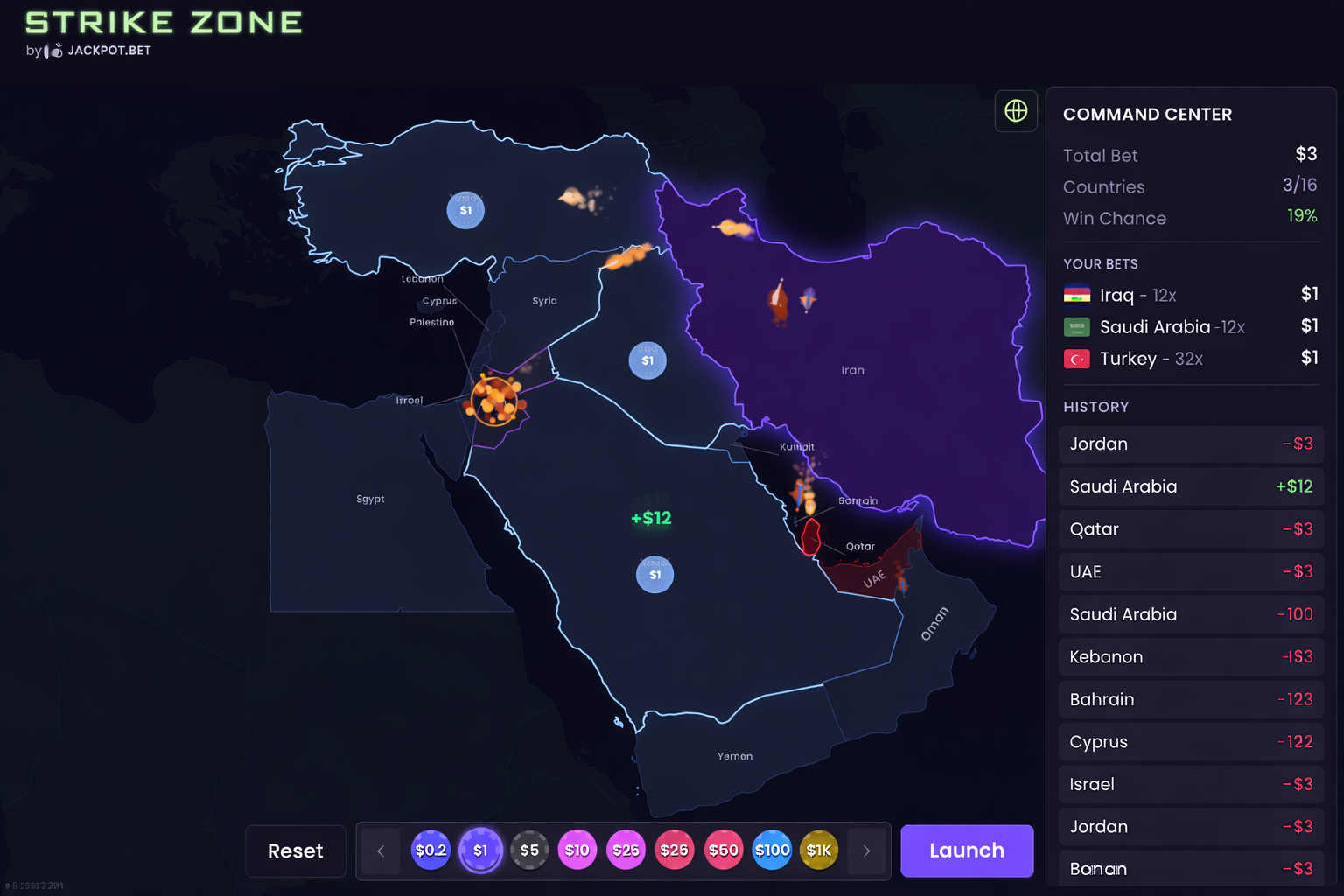 Strike Zone is a Jackpot.bet Original where you pick target countries on a Middle East map, place your bets, and launch missiles from Iran. Hit your chosen target and you collect the multiplier. Miss, and the round moves on.