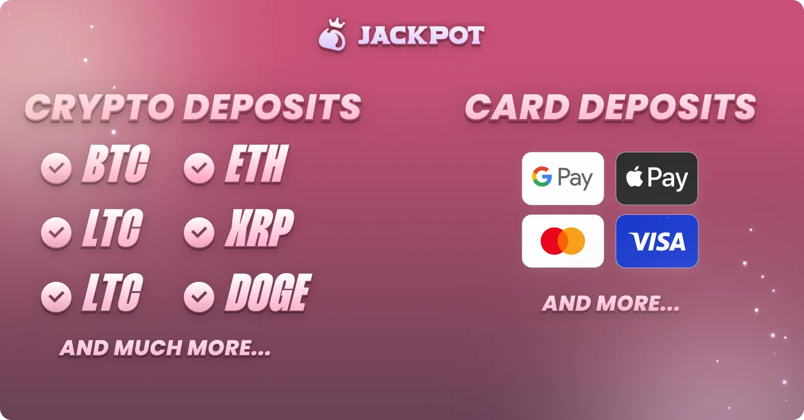 - Crypto – Choose from coins like Bitcoin, Ethereum, USDT, DOGE, and more. Copy your Jackpot.bet wallet address and send the funds from your crypto wallet. It usually takes just a few minutes.